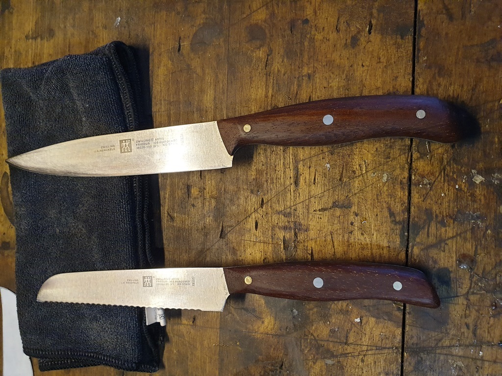 Gute Klingen aus Solingen (Zwilling Messer), jedoch sind die Griffe aus Kunststoff nicht so resistent gegen einen Fall aus Arbeitshöhe. Bei gleich zwei Messern war der Griff aus diesem Grund kaputt gegangen. Erst habe ich nur die Griffe für diese beiden Messer gemacht, aber da sie zu einem Set gehörten, wollte der Besitzer dann auch noch die restlichen Messer mit einem gleichen Griff versehen.